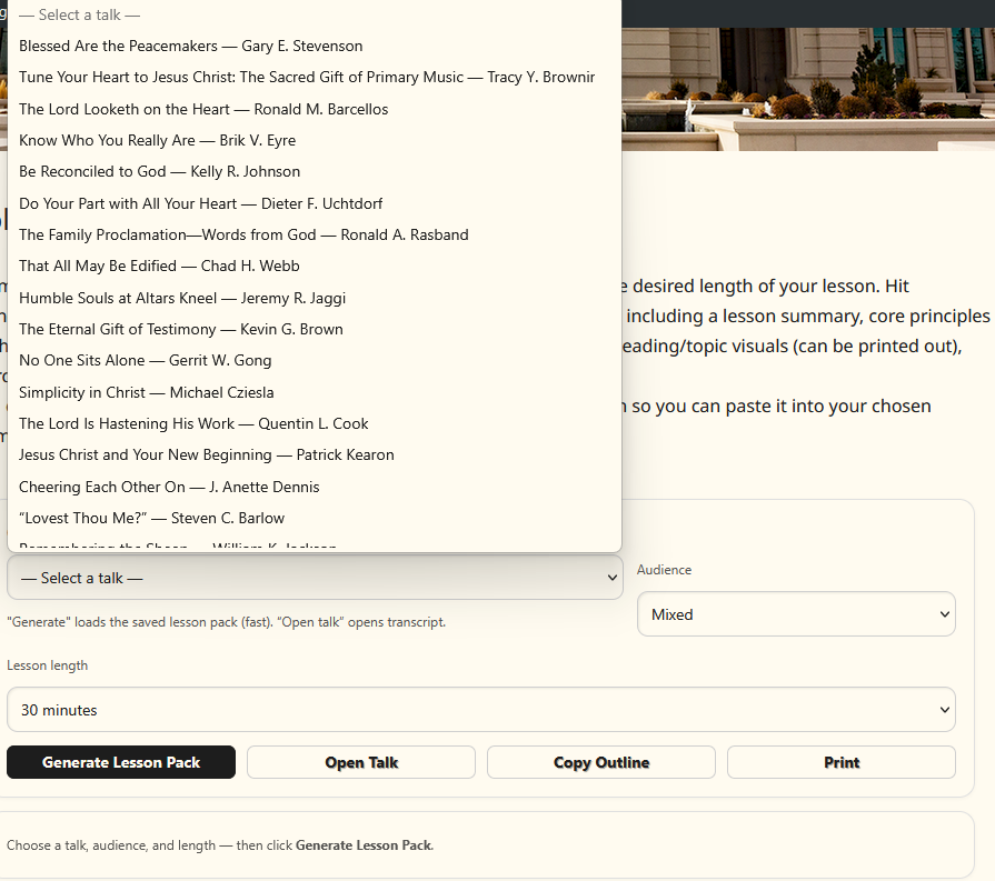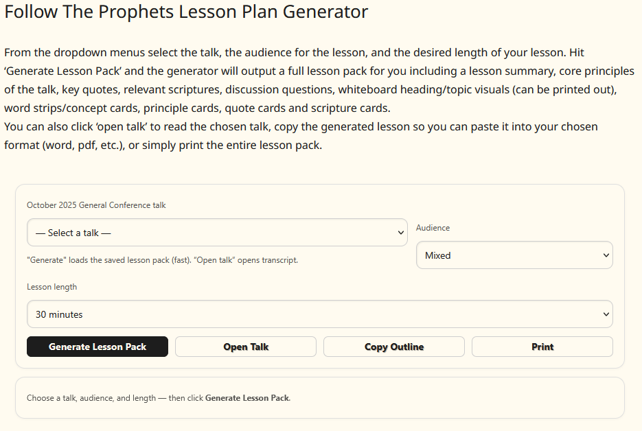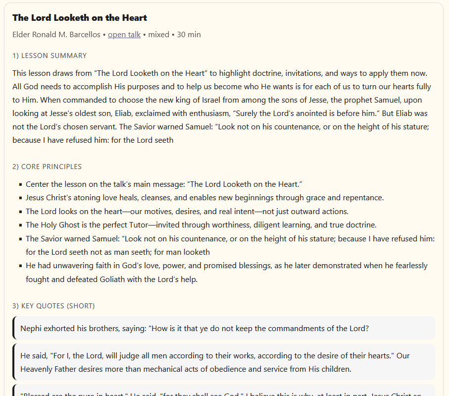 Automatically generate lesson outlines, visuals, discussion questions, and teaching aids directly from General Conference talks.